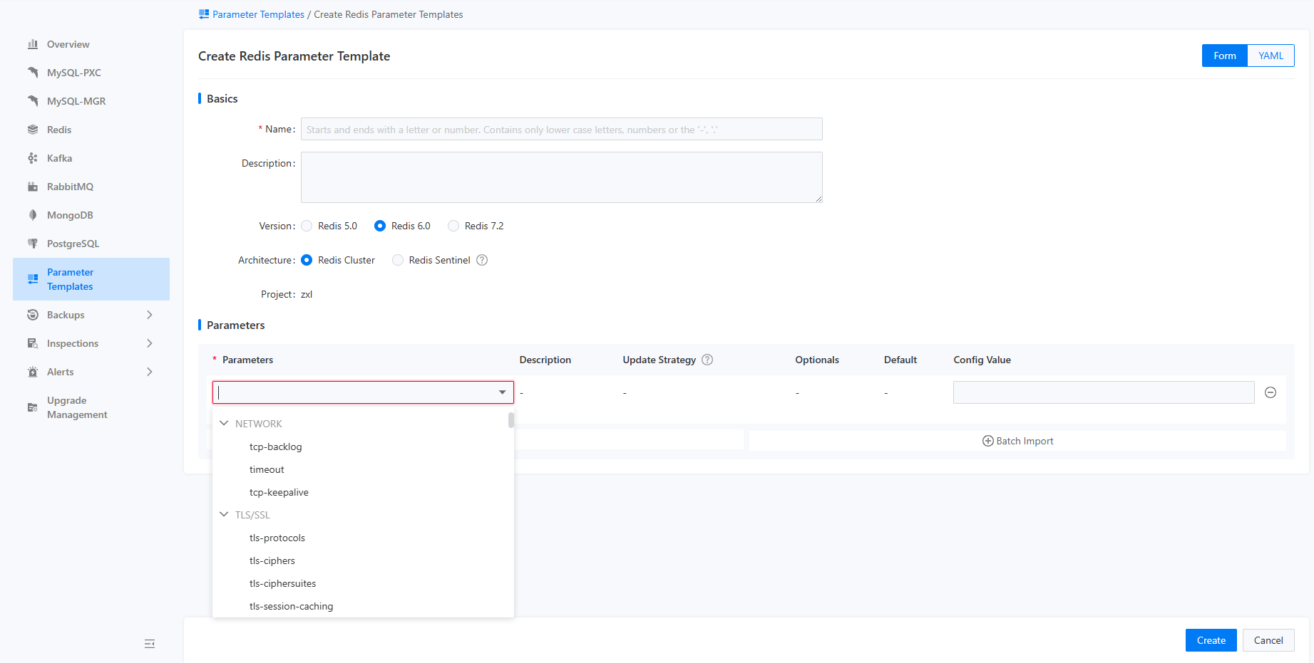 With appropriate permissions, users can click the "Create Parameter Template" button in the upper left corner to access the template creation page, as shown in the figure below.
